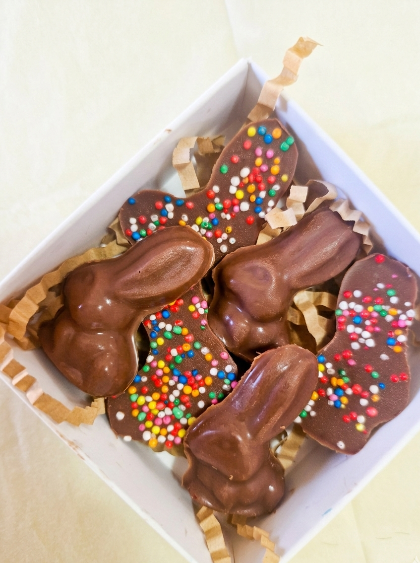 Delightful milk chocolate bunnies adorned with colourful hundreds and thousands sprinkles. Each piece combines premium chocolate with a playful finish, making them perfect for Easter gifting or a sweet treat. This charming box contains 6 bunny shaped chocolates that deliver indulgence in every bite.