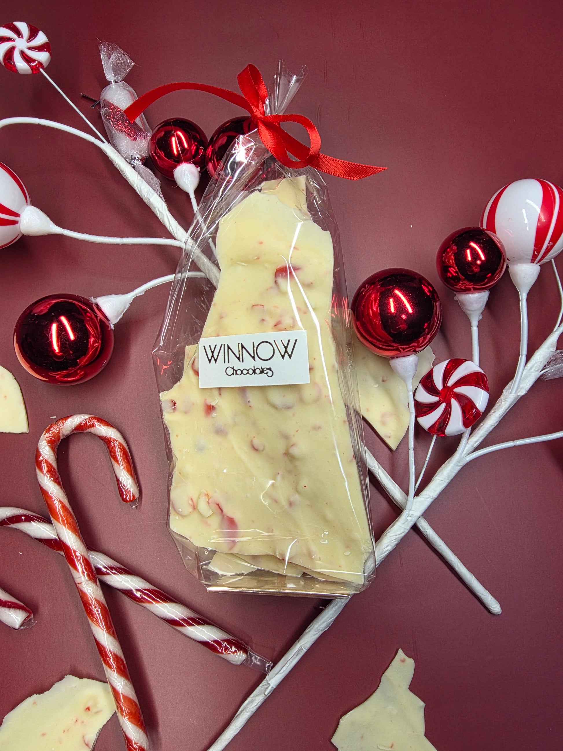 Our Festive Christmas brittle is made with premium white chocolate and is studded with vibrant red and white candy cane pieces giving a sweet, minty, and spectacularly festive feel.
